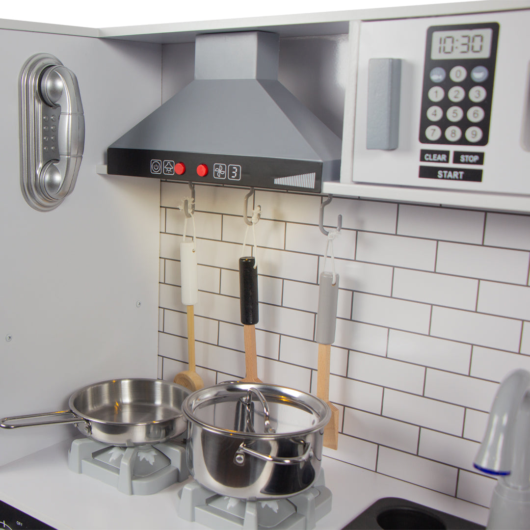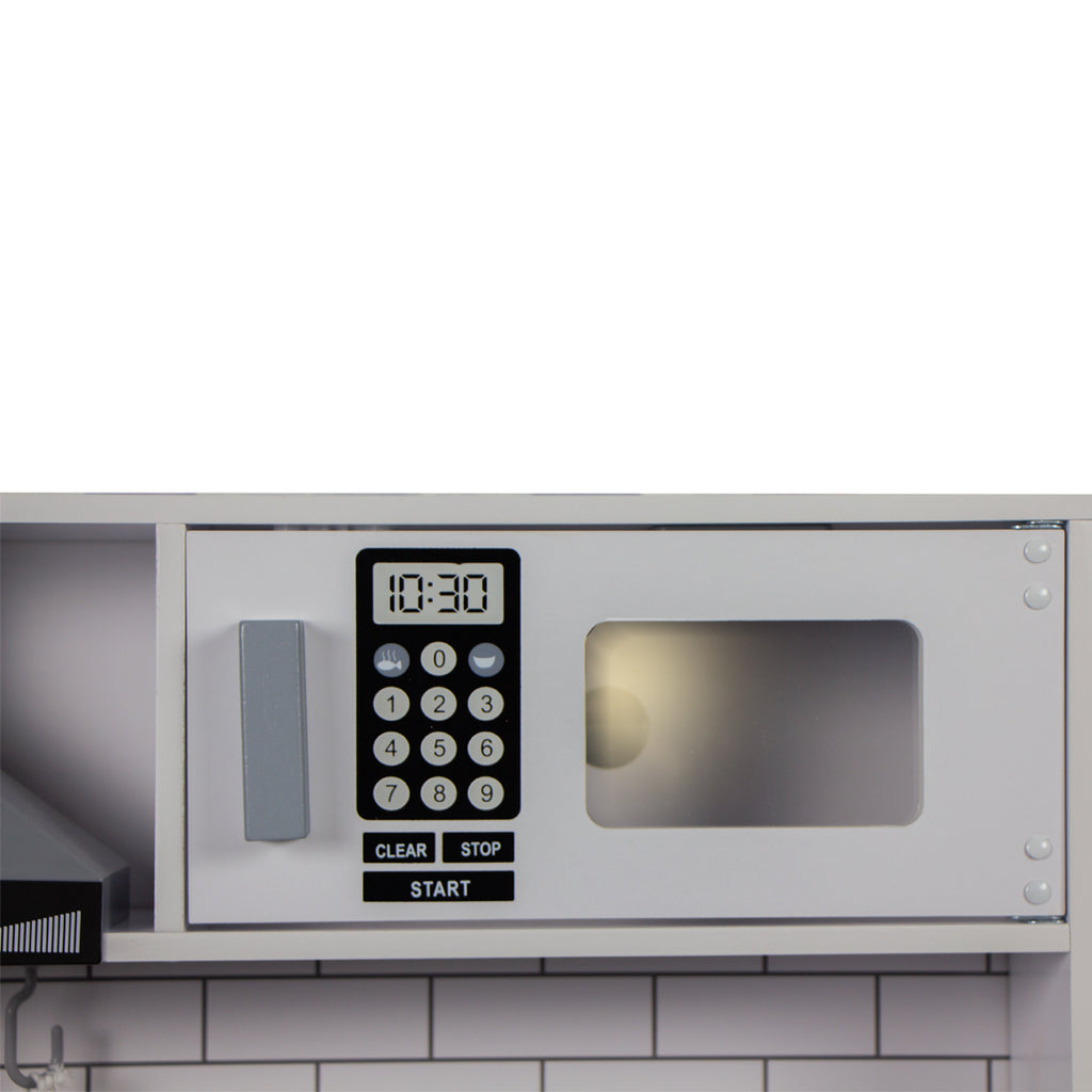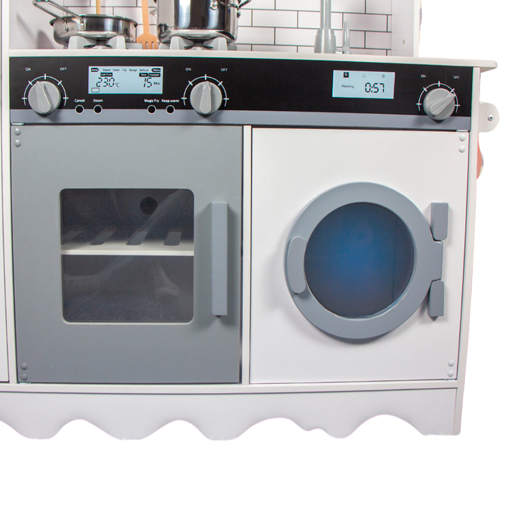 Cozinha americana completa, confeccionada em madeira MDF e melamina. Seu design atual leva para a brinquedoteca uma forma diferente e completa de apreender brincando, como noções de responsabilidade, cuidado, confraternização e socialização entre outros. Muito mais que um brinquedo, nossa cozinha é totalmente interativa, permite que os pequenos mergulhem no mundo da imaginação. Simplesmente completa, inclui dispensador de gelo suspenso com botões sonoros operado por bateria LR44, micro-ondas com som operado por bateria LR44, fogão com som e luz realistas operado por bateria LR44 (3 unidades), exaustor operado por pilha AAA (2 unidades), botões de clique, lava-louças com som operado por bateria LR44 (3 unidades), geladeira embutida, forno, além de um dispenser para a saida de água pela torneira operado por pilha AA (3 unidades) e muito mais. A cozinha também possui panelas e talheres, alem de um toalheiro real e outros detalhes autênticos como torneira e maçanetas. Apesar de seu design super extenso, o conjunto é rápido e fácil de montar com todas as ferragens e instruções incluídas (requer chave de fenda). Reuna as crianças que a brincadeira vai começar, complete a brinquedoteca com toda nossa linha e deixe o cardápio completo para o proxima refeição. Material: madeira; Faixa Etária Indicativa: 3 anos. Para funcionar os botões sonoros nas portinhas a cozinha necessita um total de 2 pilhas AAA e 3 pilhas AA que não acompanham no produto.