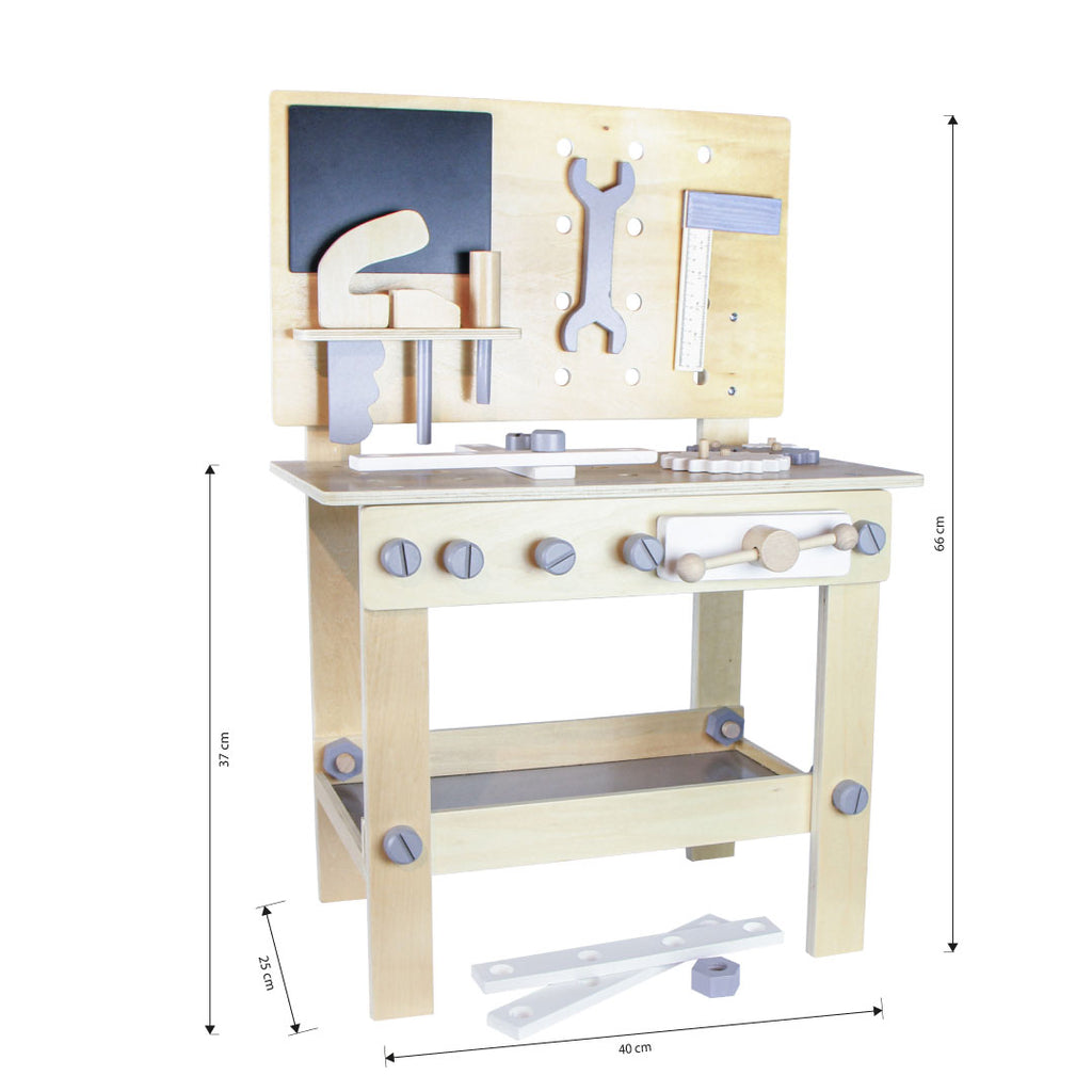MINI MARCENARIA CONFECCIONADA EM MADEIRA MDF COM ACABAMENTO REQUINTADO E PINTADO A MÃO. A LINHA DE BRINQUEDOTECA DA MODALI BABY VEM TRAZENDO AOS PEQUENOS O UNIVERSO FAZ DE CONTA. ONDE ELES VIVENCIAM O COTIDIANO DE FORMA LÚDICA E CRIATIVA. CADA PEÇA FOI DESENHADA COM DETALHES REAIS PARA DEIXAR A BRINCADEIRA MUITO MAIS DIVERTIDA. A MESINHA MARCINEIRO É COMPOSTA POR 21 PEÇAS: 1 SERROTE MADEIRA COM CINZA (18 X 8.5 X 1.5) ; 1 CHAVE COMBINADA CINZA COM IMÃ (16 X 5,5 X 1,5); 1 ESQUADRO MADEIRA COM CINZA COM IMÃ (15 X 8,5 X 1,5); 1 MARTELO MADEIRA COM CINZA (12,5 X 5 X 3); 1 CHAVE DE FENDA MADEIRA COM CINZA (12 X 2,5); 5 PARAFUSOS MADEIRA COM CINZA (6 X 2,5); 1 ENGRENAGEM BRANCA (10 X 0,5) : 1 ENGRENAGEM CINZA (7 X 0,5); 1 ENGRENAGEM BRANCA (5 X 0,5); 1 ENGRENAGEM CINZA (5 X 0,5); 1 PORCA CINZA (1,8 X 3,5); 4 PEÇAS DE ENCAIXE BRANCA (1,3 X 22 X 3): 1 TORNO MADEIRA COM BRANCO (4 X 14 X 5 ); 1 LOUSINHA (12,5 X 16 X 0,2) . SUA ESTRUTURA CONTÉM BASE E PAINEL DE APOIO ALÉM DE UM COMPARTIMENTO PARA GUARDAR AS FERRAMENTAS (39 X 22) . MEDIDA DA BANCADA ATÉ O CHÃO (37,5).