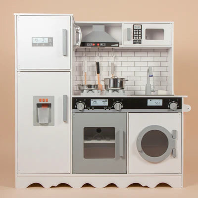 Cozinha americana completa, confeccionada em madeira MDF e melamina. Seu design atual leva para a brinquedoteca uma forma diferente e completa de apreender brincando, como noções de responsabilidade, cuidado, confraternização e socialização entre outros. Muito mais que um brinquedo, nossa cozinha é totalmente interativa, permite que os pequenos mergulhem no mundo da imaginação. Simplesmente completa, inclui dispensador de gelo suspenso com botões sonoros operado por bateria LR44, micro-ondas com som operado por bateria LR44, fogão com som e luz realistas operado por bateria LR44 (3 unidades), exaustor operado por pilha AAA (2 unidades), botões de clique, lava-louças com som operado por bateria LR44 (3 unidades), geladeira embutida, forno, além de um dispenser para a saida de água pela torneira operado por pilha AA (3 unidades) e muito mais. A cozinha também possui panelas e talheres, alem de um toalheiro real e outros detalhes autênticos como torneira e maçanetas. Apesar de seu design super extenso, o conjunto é rápido e fácil de montar com todas as ferragens e instruções incluídas (requer chave de fenda). Reuna as crianças que a brincadeira vai começar, complete a brinquedoteca com toda nossa linha e deixe o cardápio completo para o proxima refeição. Material: madeira; Faixa Etária Indicativa: 3 anos. Para funcionar os botões sonoros nas portinhas a cozinha necessita um total de 2 pilhas AAA e 3 pilhas AA que não acompanham no produto.