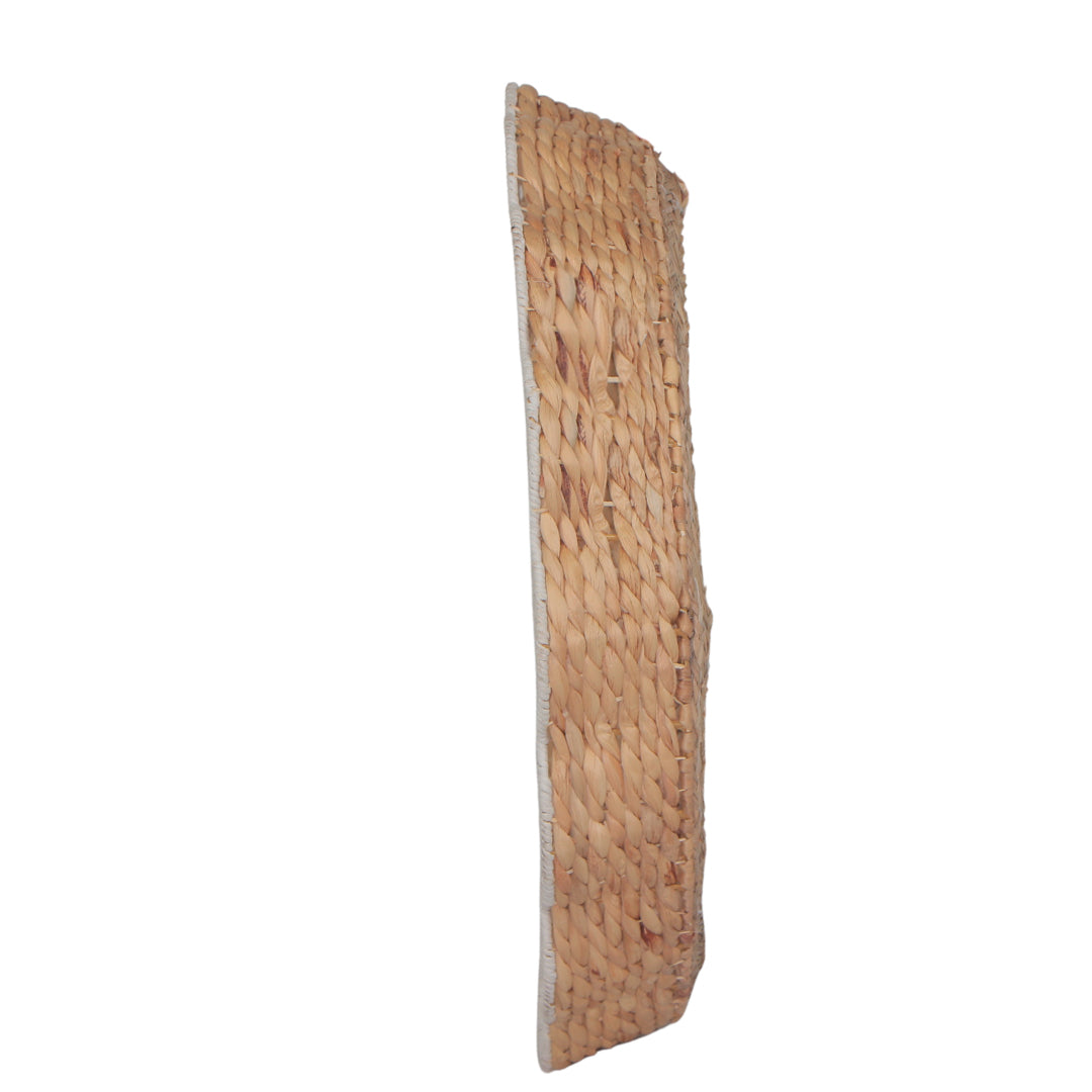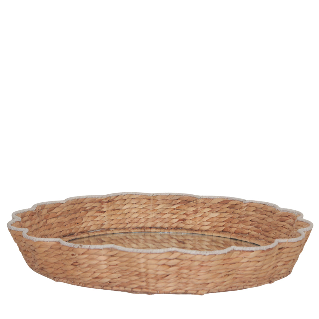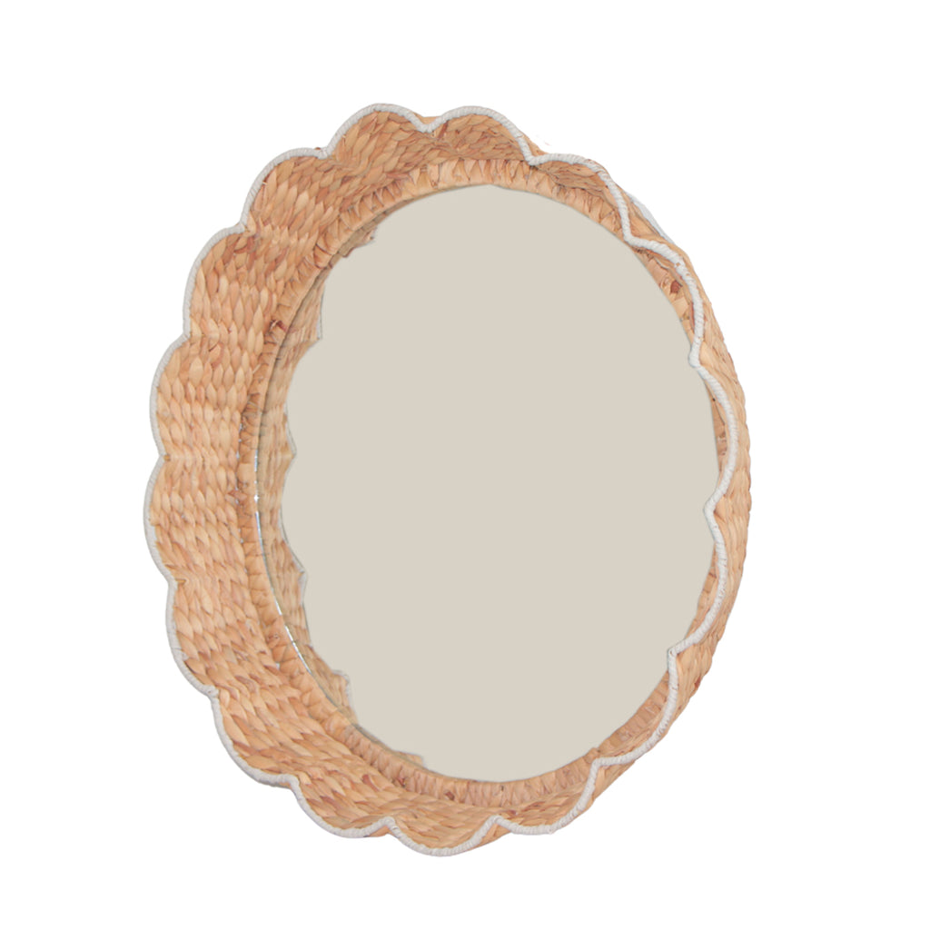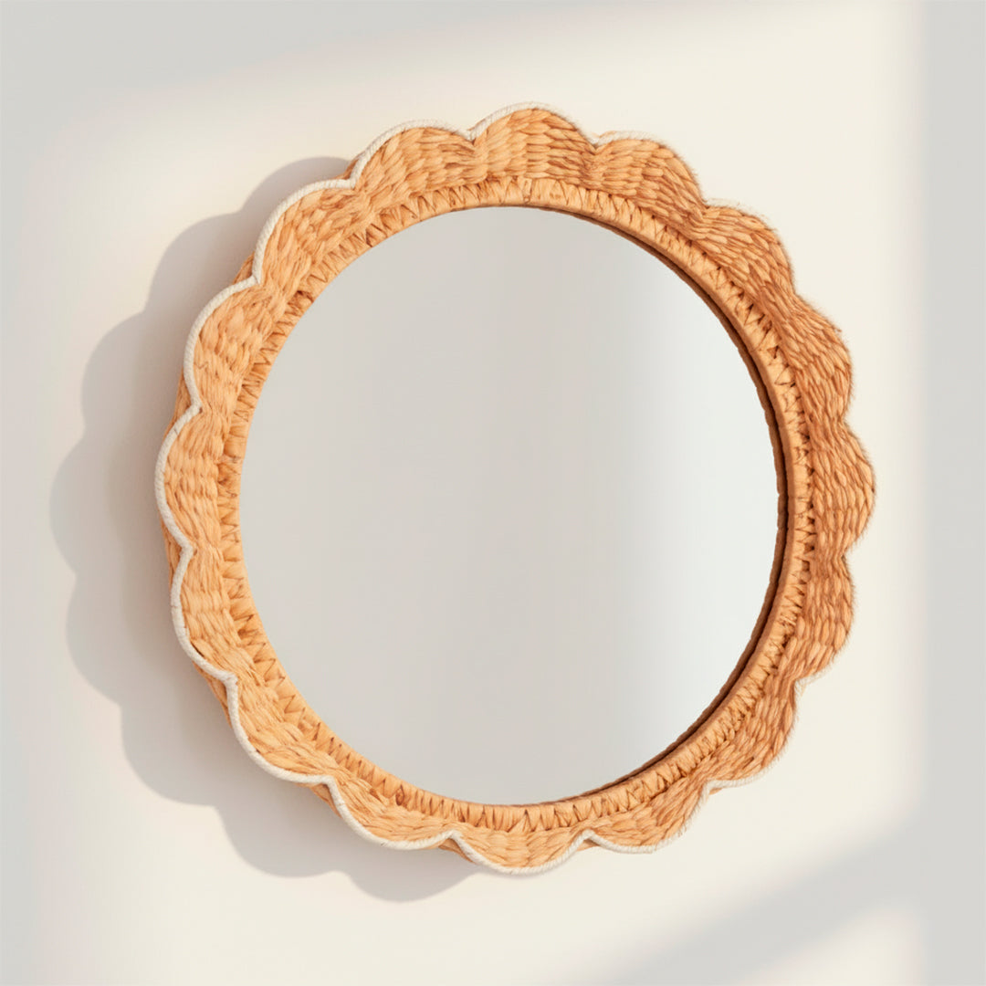 ESPELHO EM RATTAN COM EFEITO DE ONDAS. SUA TEXTURA ENTRELACADA COM A BORDA BRANCA PINTADA A MAO, TRANSMITE LEVEZA E SOFISTICACAO.